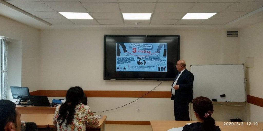 2020-yil 3-mart kuni TDO‘TAU huzuridagi pedagog kadrlarni qayta tayyorlash va ularniing malakasini oshirish tarmoq markazida “O‘zbek tili va adabiyoti” yo‘nalishi tinglovchilari uchun “Korrupsiyaga qarshi kurash: Iqtisodiy, ma’naviy-ma’rifiy choralari va yo‘llari mavzusida” mashg‘ulot bo‘lib o‘tdi. Mashg‘ulotni texnika fanlari nomzodi, professor Rauf Yarkulov olib bordi.