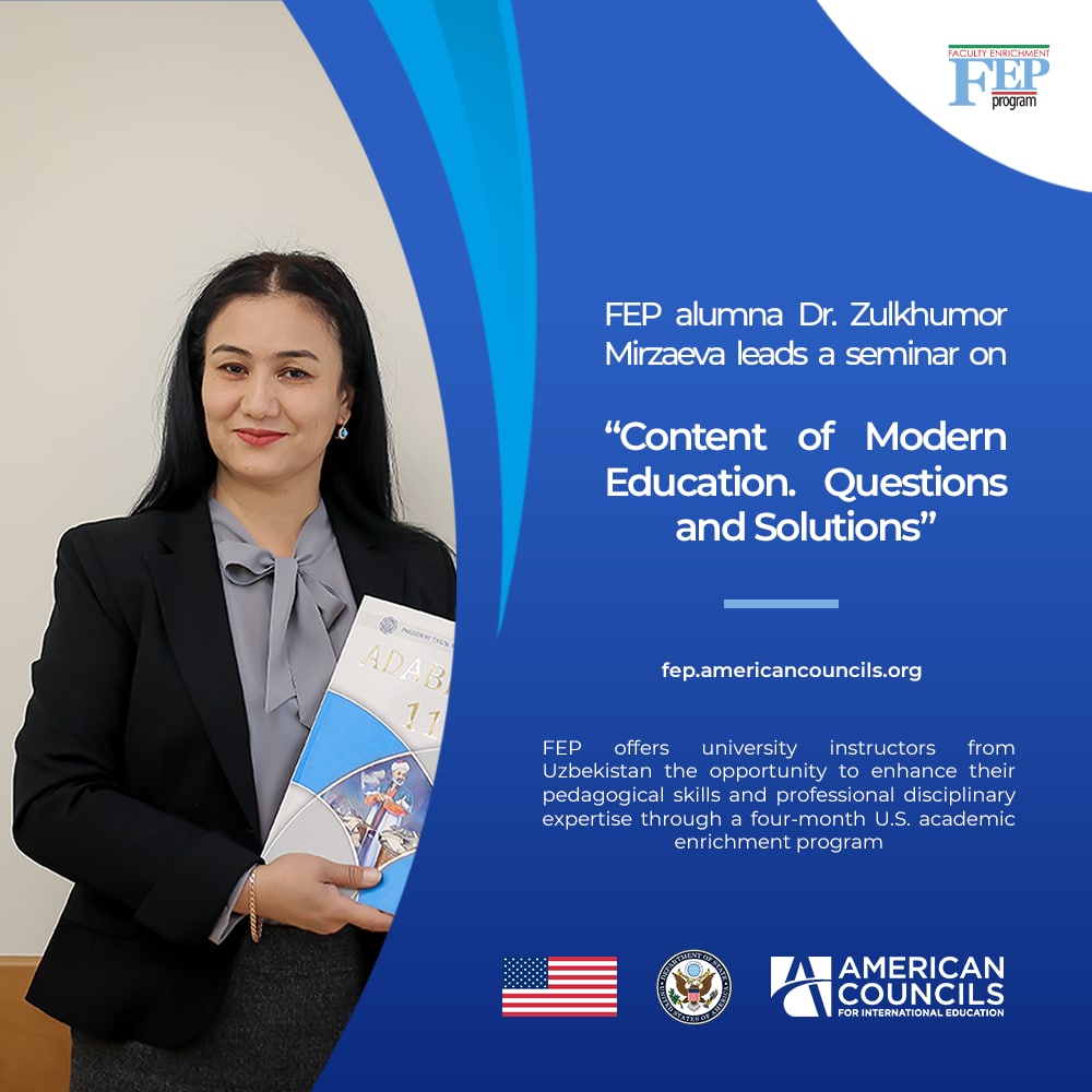 On January 12, FEP fellow Dr. Zulkhumor Mirzaeva was invited as a guest speaker to the «Content of modern education. Questions and solutions» seminar.