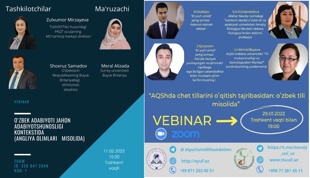 «El-yurt umidi» jamg‘armasi Axborot xizmati rahbari M. Sodiqov, Alisher Navoiy nomidagi Toshkent davlat o‘zbek tili va adabiyoti univetsiteti Amaliy filologiya fakulteti dekani, filologiya fanlari doktori, professor S. X. Muhamedova, «El-yurt umidi» jamg‘armasi Хorijda faoliyat yuritayotgan va qimmatli tajribaga ega bo’lgan vatandoshlar bilan muloqot qilish bo‘limi boshlig‘i J. Quryozov, AQSh Indiana universiteti «Til mukammalligi va texnologiyalari Markazi» kordinatorining yordamchisi U. Hikmatillayevalar ishtirokida «AQShda chet tillarini o‘qitish tajribasidan: o‘zbek tili misolida» kabi mavzularda vebinarlar o’tkazildi.